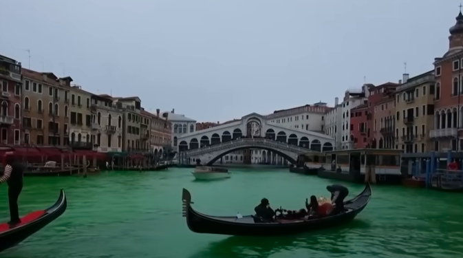 Avec des membres du mouvement écologiste britannique Extinction Rebellion (XR), elle a teint en vert vif les eaux du Grand Canal en y déversant un colorant traceur non toxique, couramment utilisé dans les études environnementales.